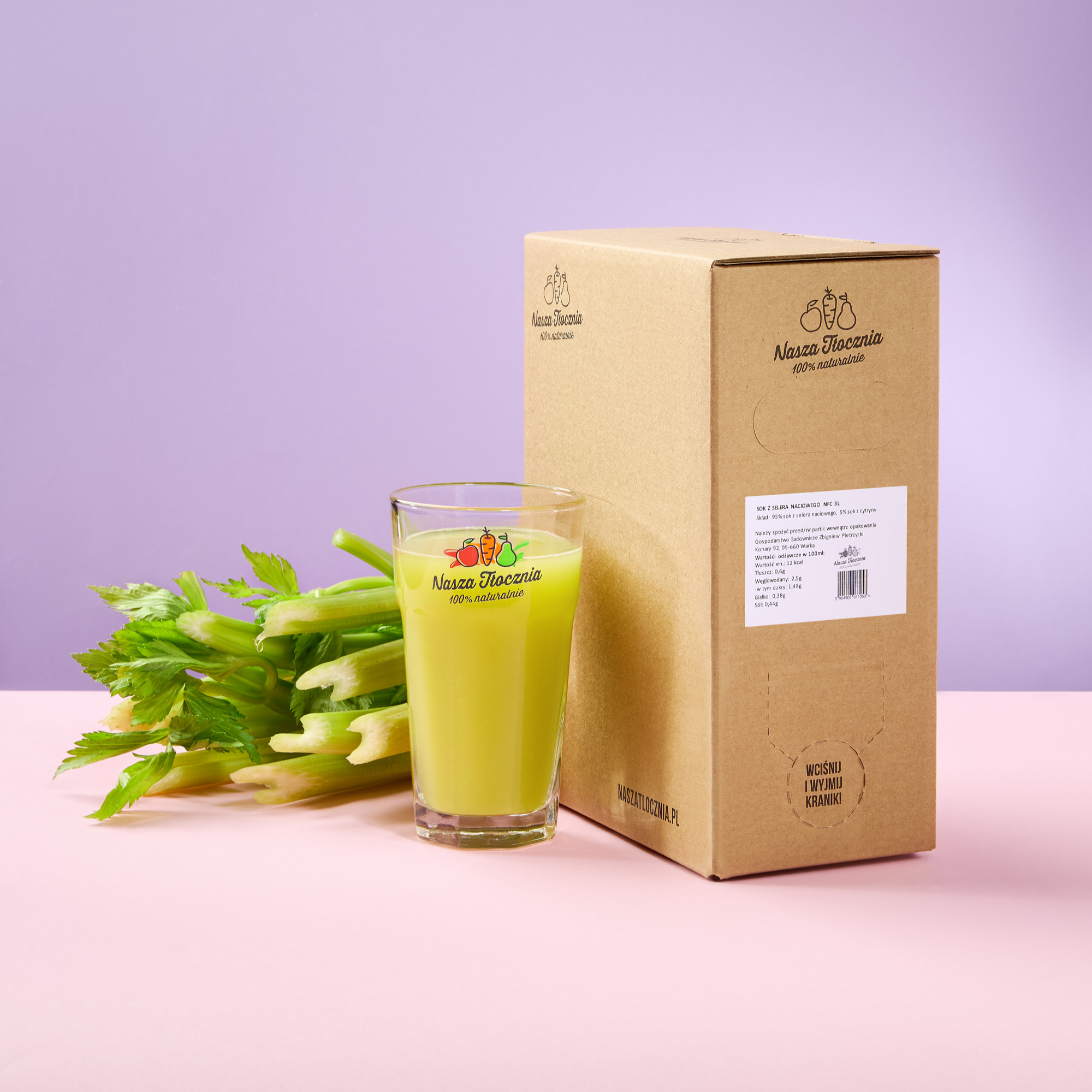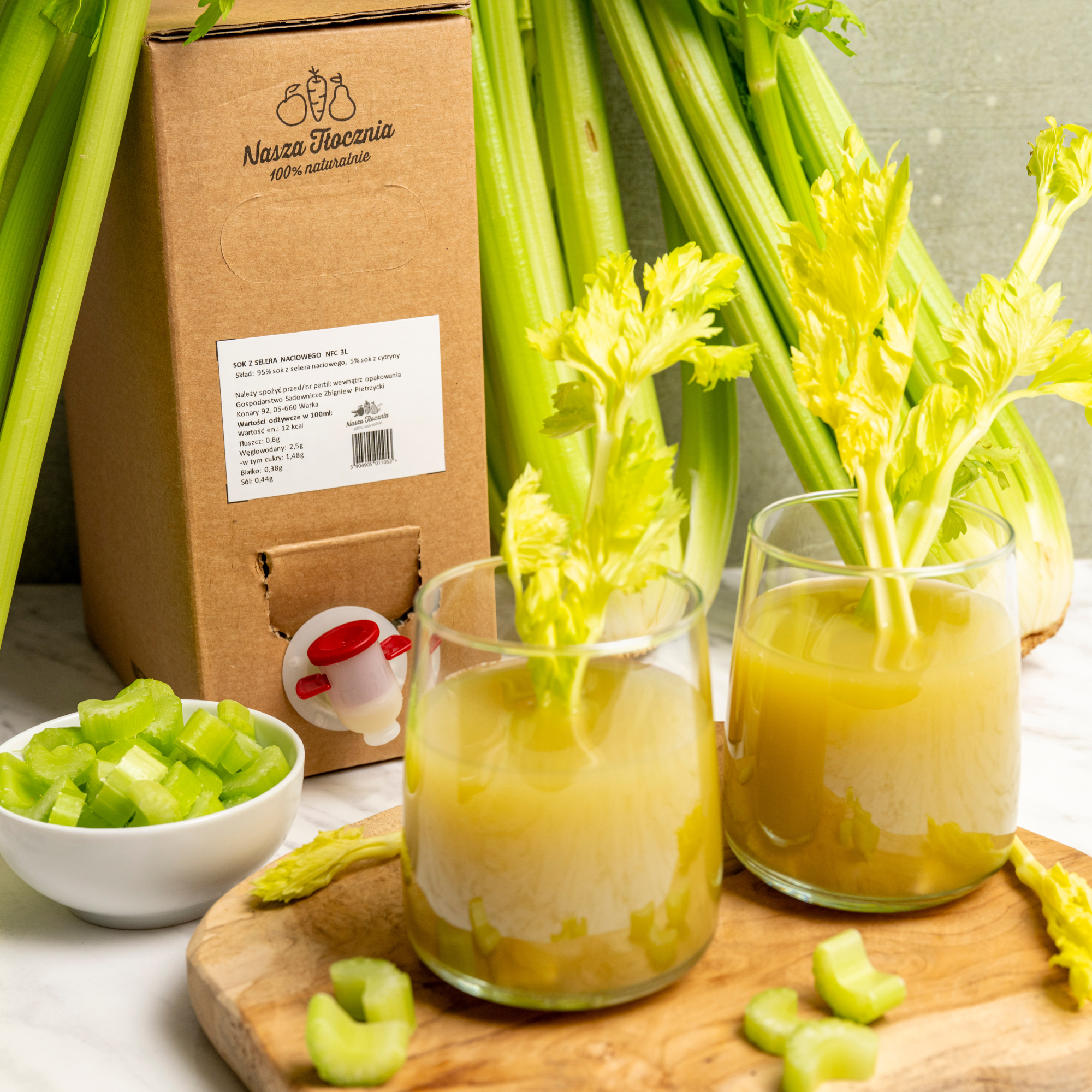 Dla osób, które nie mają czasu na codzienne wyciskanie łodyg, wygodną alternatywą jest gotowy sok NFC z selera naciowego, tłoczony na zimno i delikatnie pasteryzowany. Dzięki temu można sięgnąć po niego niezależnie od sezonu.